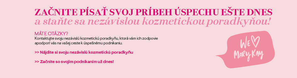 - Podnikanie s Mary Kay prináša oveľa viac než len predaj neodolateľných kozmetických produktov. Ponúka najmä podnikateľskú nezávislosť, časovú flexibilitu, neobmedzený finančný rast, ako aj priestor pre vlastný osobný rozvoj. Je len na vás, či sa kariérnej príležitosti chopíte iba ako svojej voľnočasovej záľuby alebo si kariéru nezávislej kozmetickej poradkyne rozbehnete naplno. Sami si plánujete svoj rozvrh a tempo, akým sa budete krôčik po krôčiku posúvať k úspechu. Možností je mnoho a je len na vás, ktorú cestu si zvolíte. Prečítajte si viac o tom, čo ponúka podnikanie s Mary Kay alebo sa spojte so svojou nezávislou kozmetickou poradkyňou, aby vás previedla svetom Mary Kay.