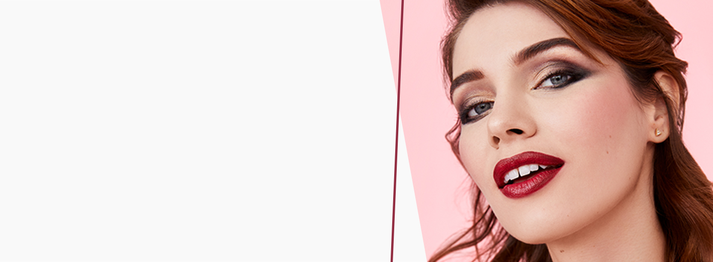 Na perách vytvorte ombre efekt pomocou Kontúrovacej ceruzky na pery s odtieňom Berry a Gélového polomatného rúžu s odtieňom Berry Famous, ktorý nanesiete na vonkajšiu časť pier. Len strednú časť pier potom vyplňte Gélovým polomatným rúžom s odtieňom Red Stiletto.